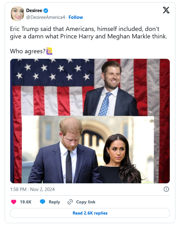 Following the election, royal commentators have speculated that Meghan may be rethinking her residence in the U.S. due to the result. Unlike in previous years, Meghan and Prince Harry opted to stay relatively quiet during this election, choosing instead to promote voter turnout without openly supporting any specific candidate.