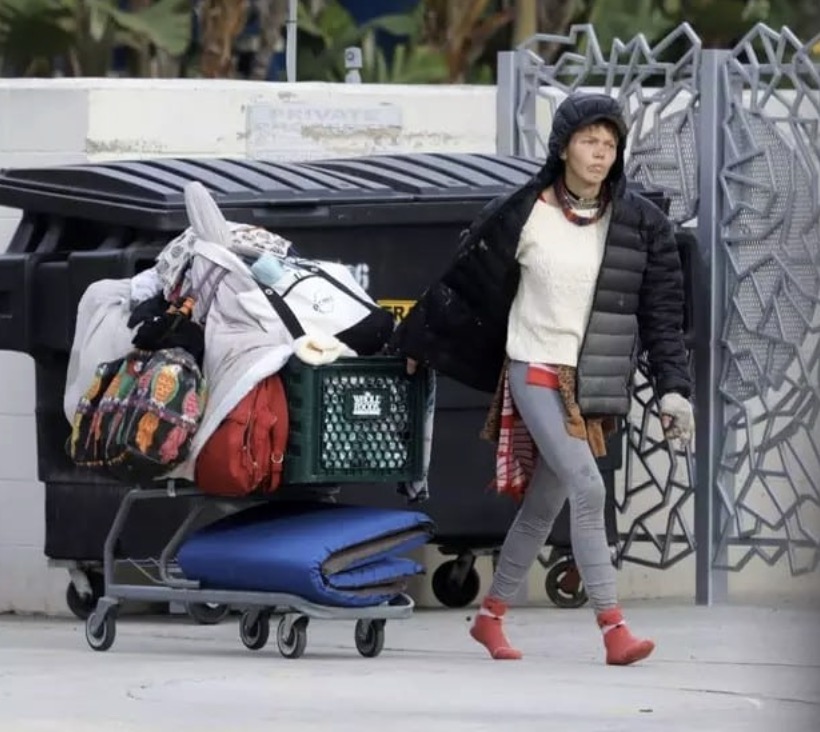 The former stunning blonde model now appears unrecognizable, clad in worn and soiled clothing.